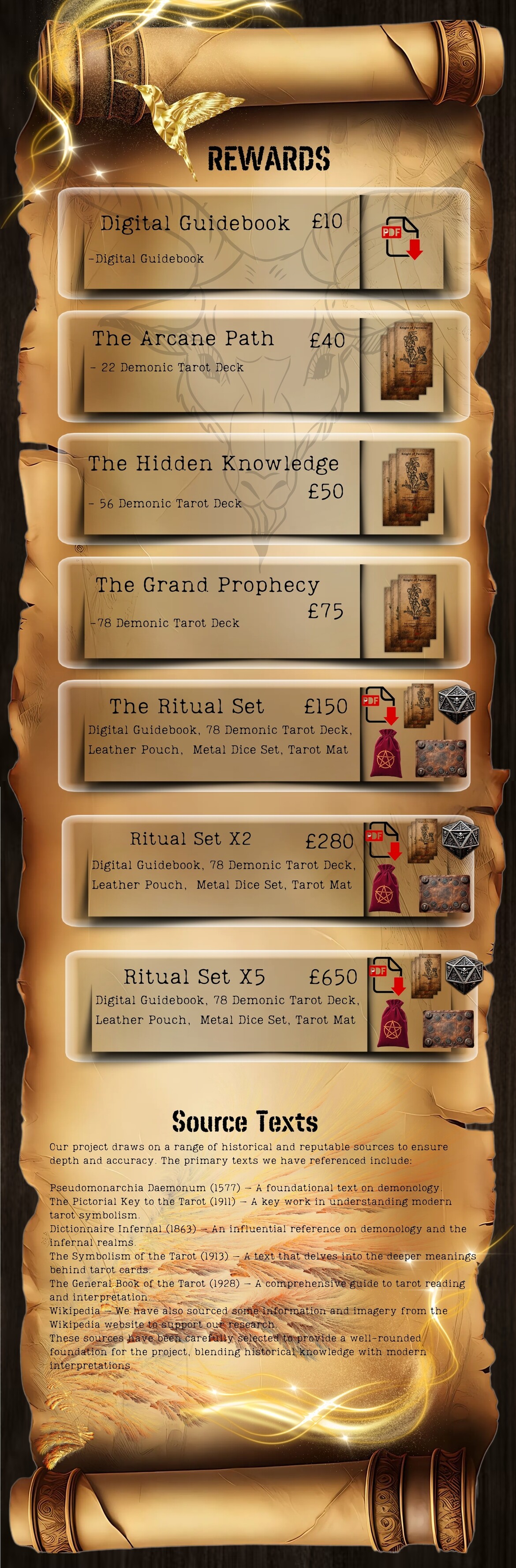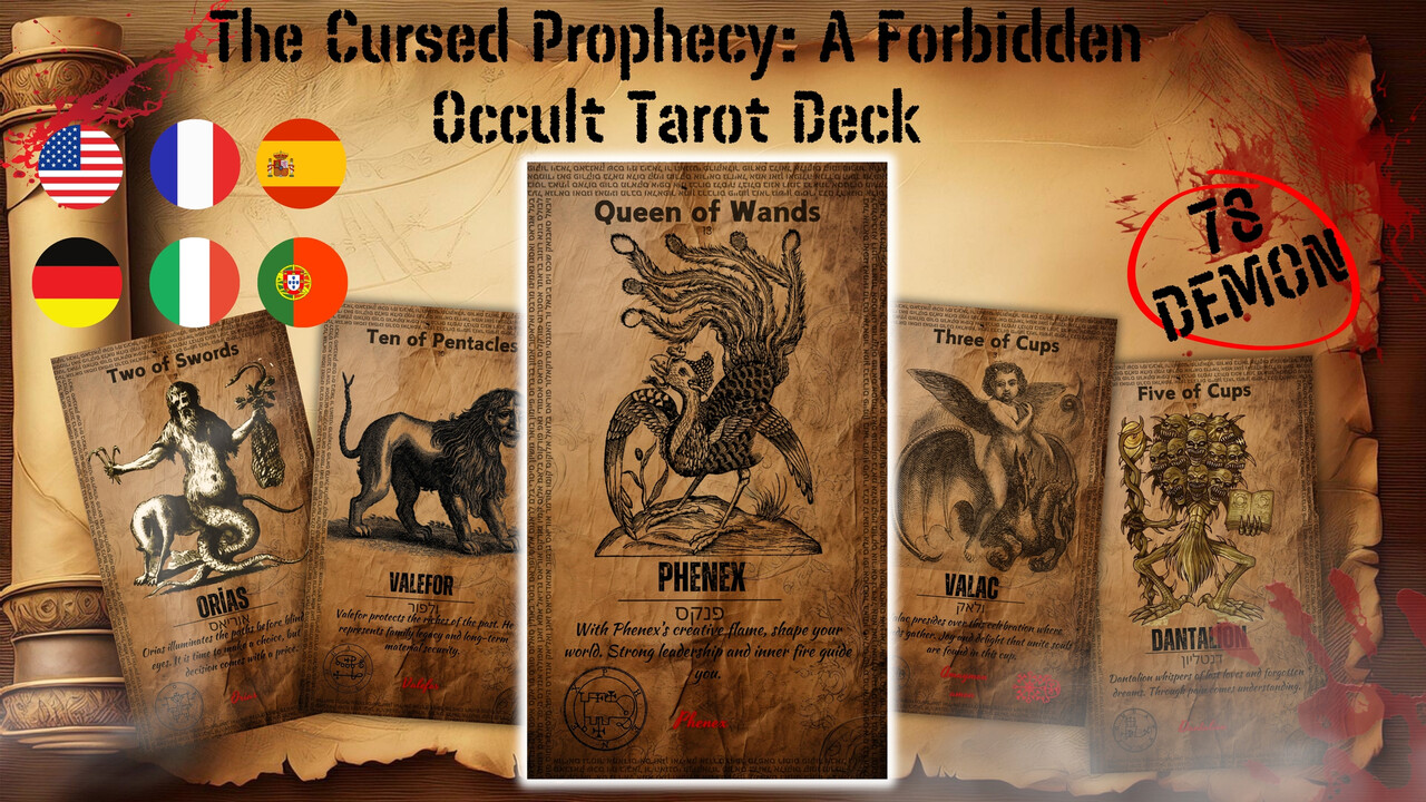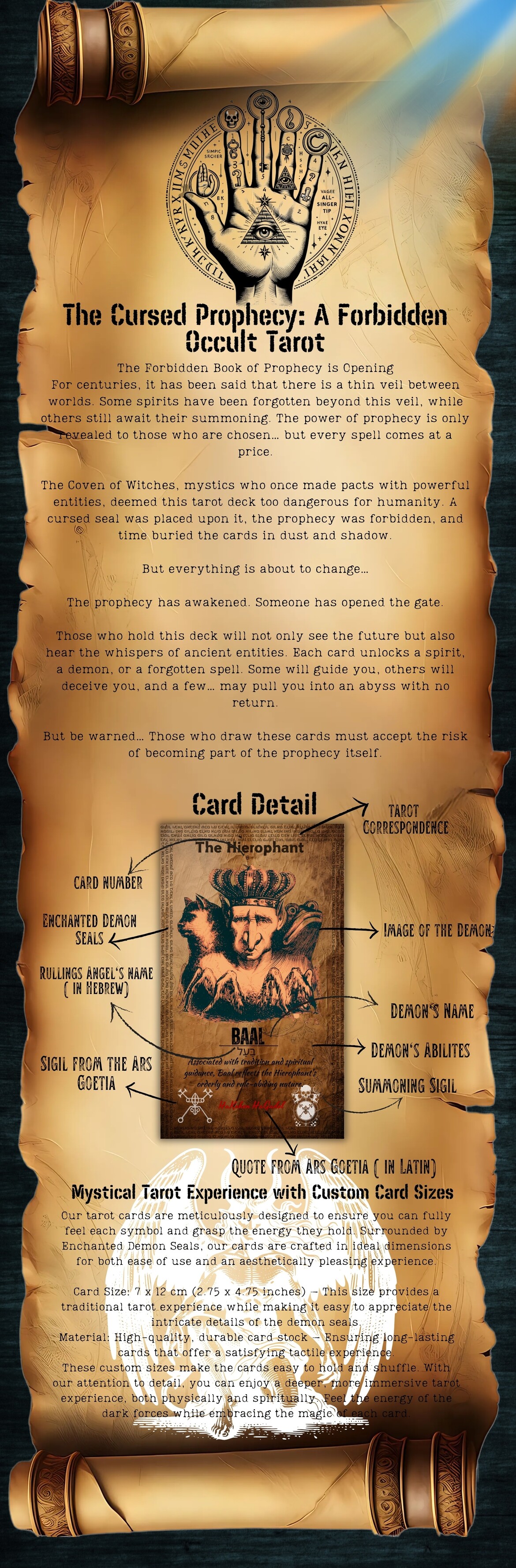 A full 78-card Tarot deck! (Major + Minor Arcana).The ultimate prophetic experience awaits. This complete deck brings together both the Major and Minor Arcana, making it the perfect tool for deep divination, rituals, and unlocking the ancient mysteries that guide us. If you dare to unveil the cursed prophecy, this deck is for you!