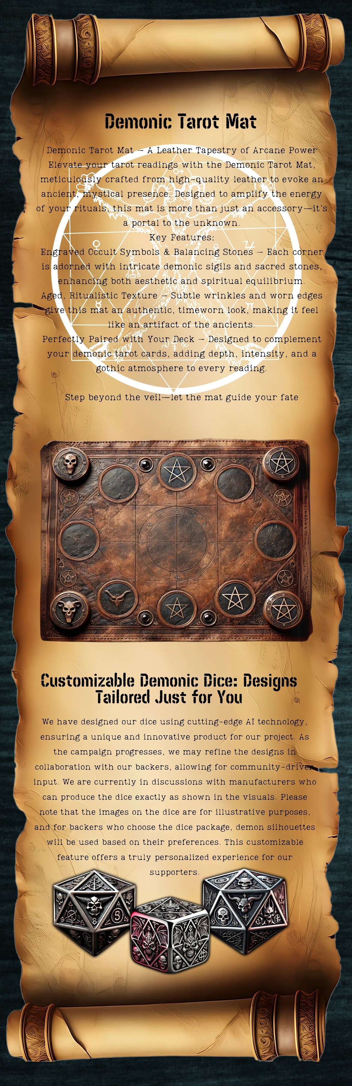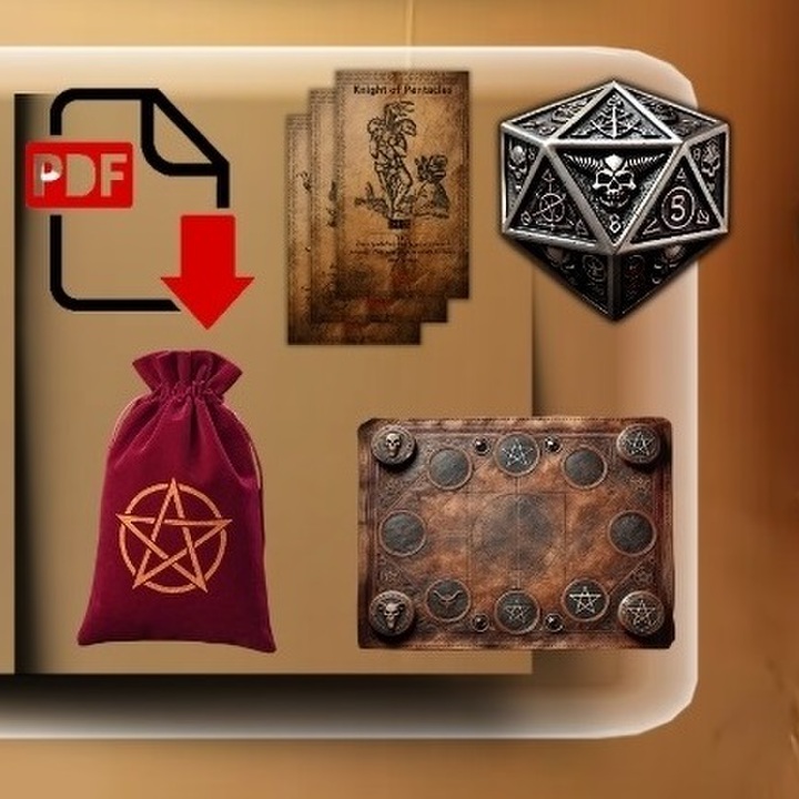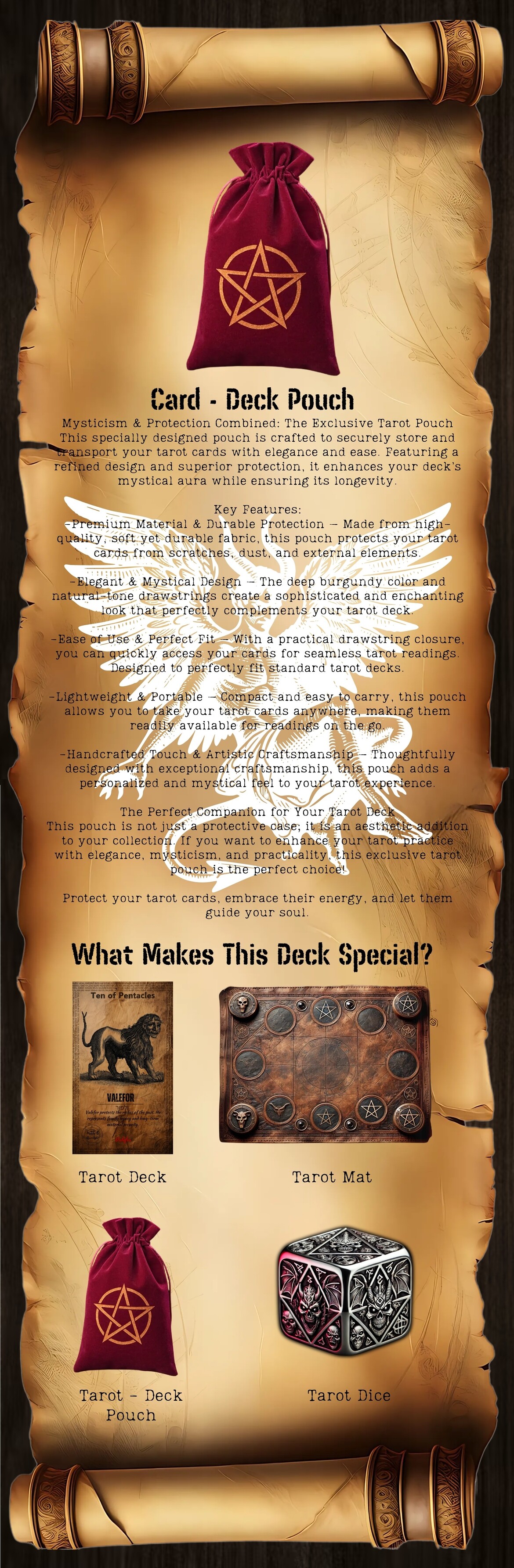Full Tarot Deck (78 Cards – Major & Minor Arcana) Mystically designed Tarot Mat Occult Tarot Dice inscribed with arcane symbols Handcrafted Ritual Pouch for Tarot Storage More than just a tarot deck this is a complete divination and ritual set. Perform your readings on a sacred tarot mat, enhance your practice with arcane dice, and safeguard your deck with a mystical pouch designed to protect its energy. This is the ultimate experience for true seekers of the occult.