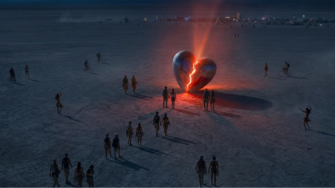 The project features a large heart sunk in the desert sand of Black Rock City.