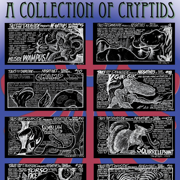 Last one! I made a limited edition run of ten 18" x 24" "Collection of Cryptids" posters in 2016 around the time I published my deluxe re-issues of my first four books. It features a series of black and white comics on a color background. There are "real" cryptids like Champ, the Lake Champlain Monster featured as well as a few I made up...or did I? Will be mailed in a separate round poster tube.