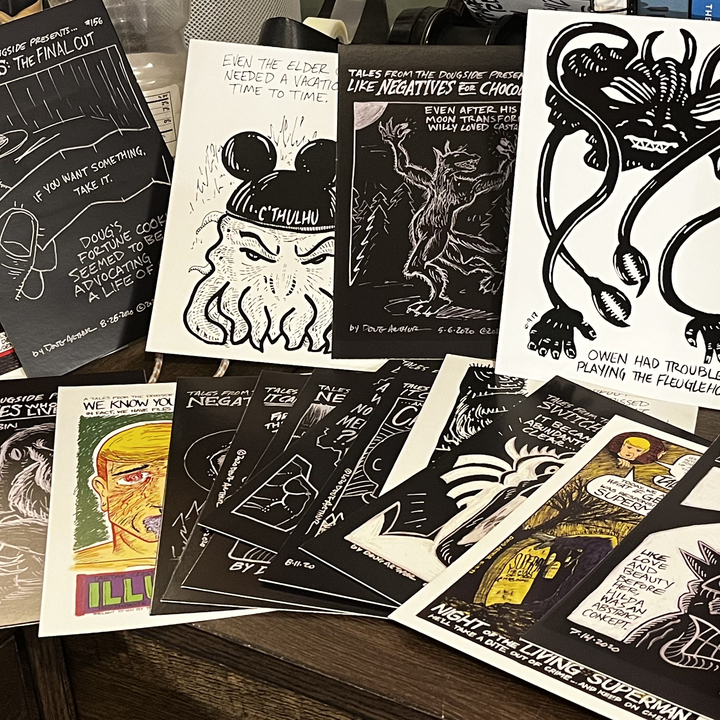 A complete set of 18 Tales From the Dougside postcards! Each heavy stock card measures in at a generous 5" x 7" and lovingly reproduces some of my favorite comic strips from the last couple of books! Send them to friends and foes alike! ...or keep 'em for yourself!