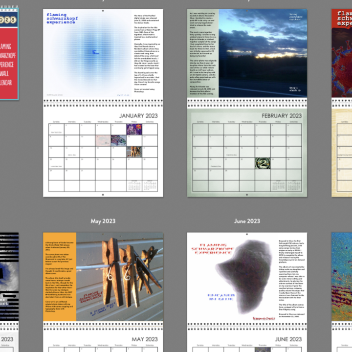 2023 Wall Calendar featuring loads of cover art and trivia from my band Flaming Schwarzkopf Experience! FSE started off as a joke band in Tales From the Dougside, but some years later I started creating music and decided it should be a real band name, and it has been in use ever since! With more than 30 releases since the 2010 debut EP, Flying To Orlando, there is lots to enjoy here, and will keep you up to date for all of 2023!