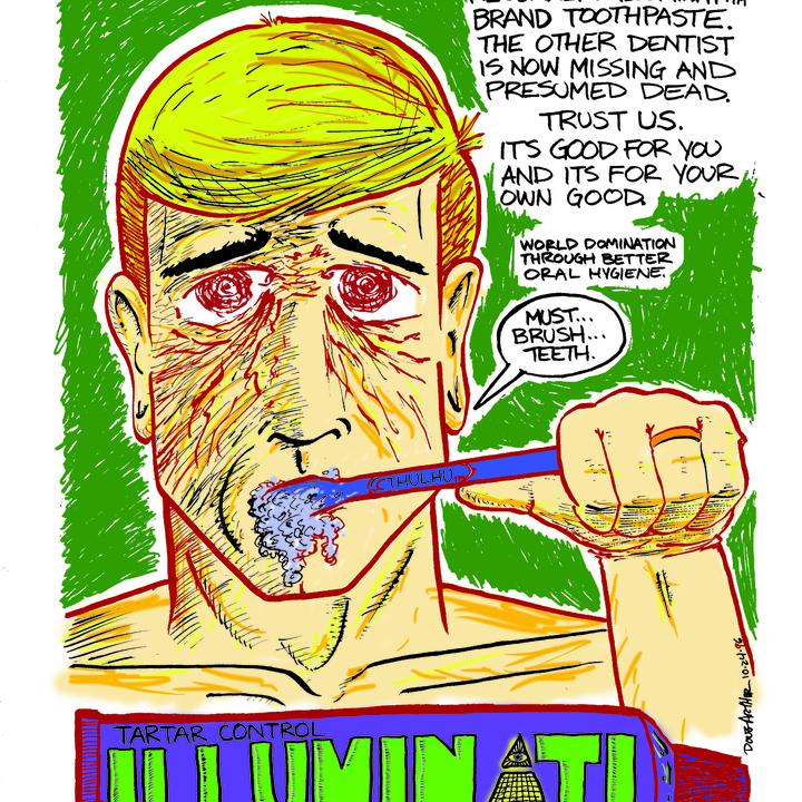 11' x 17" signed, limited edition colort art print on thick, heavy stock, suitable for framing. Illuminati Toothpaste. We have files on you...