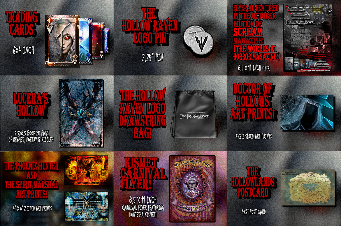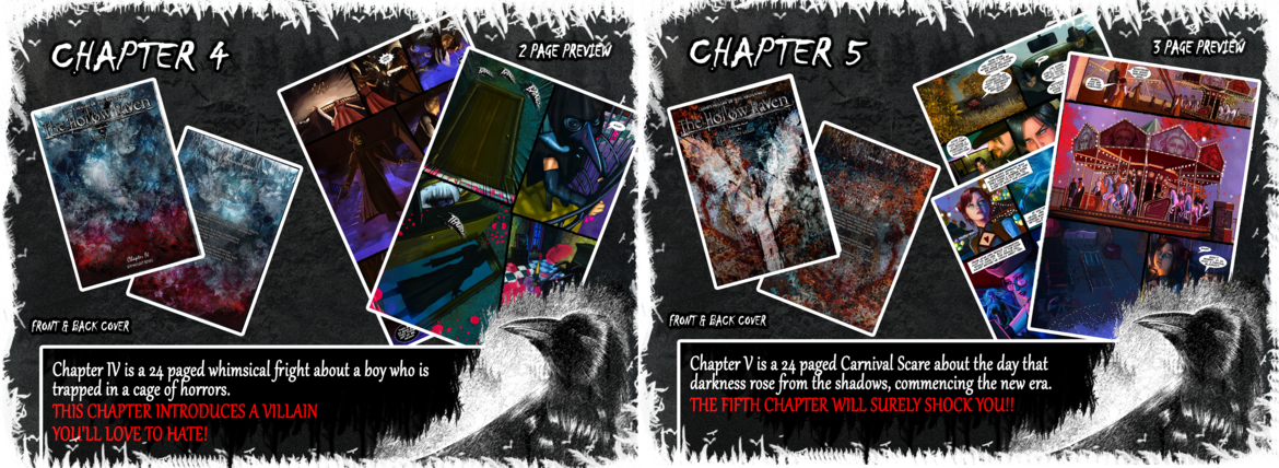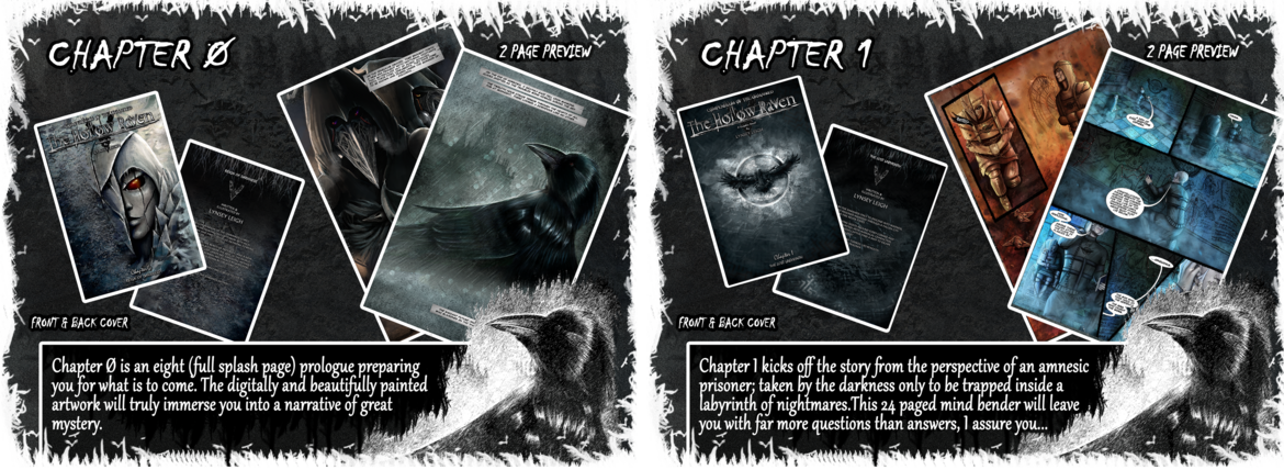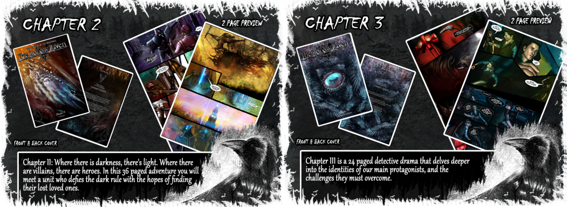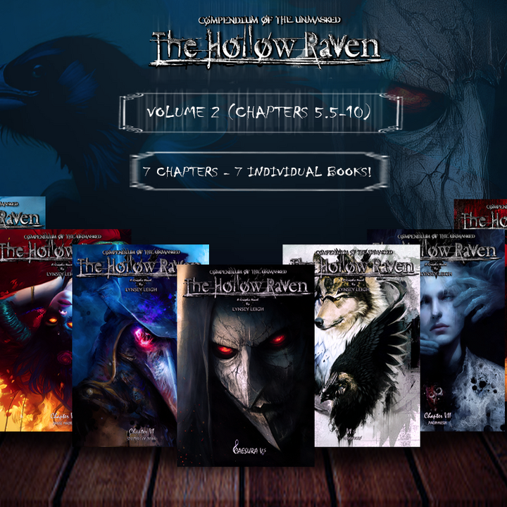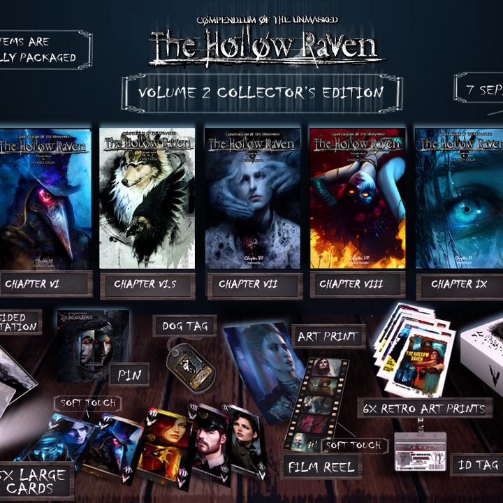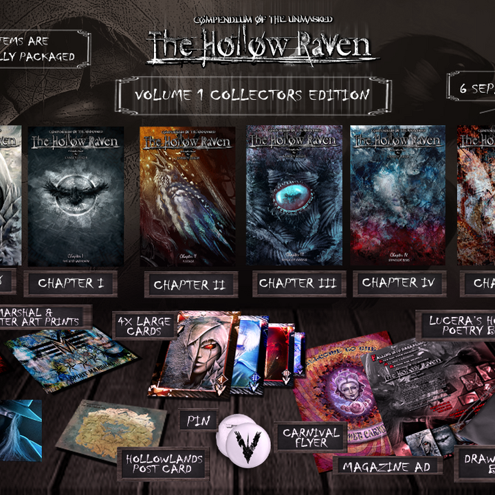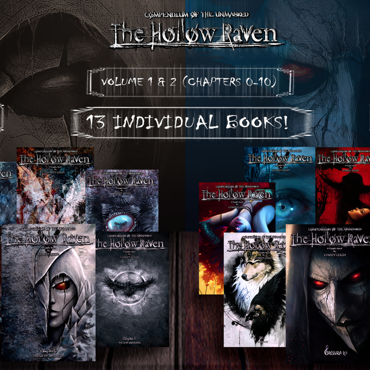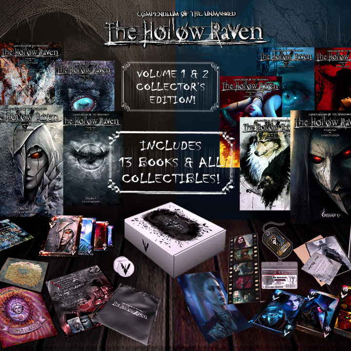 The Hollow Raven Volume 1 & 2 Collector's Edition includes EVERYTHING at a discount! Chapters 0-10 along with all extra volume 1 & 2 goodies! Furthermore, Chapter 0 & 5.5 will be signed! Hand packaged with magazine covers, top loaders, and tons of other items!