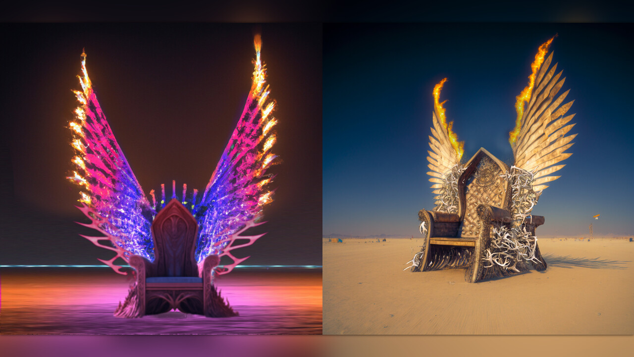 "The Lite of Spring" is a striking art installation which will be built for the 2023 Burning Man Art Festival. It will be featuring a pair of imposing back-to-back thrones with a 12-foot wingspan made of wood and antlers. During the day, the wings appear as a natural extension of the thrones, but at night, they come alive with fire from a propane fire system built into the structure, creating a warm and inviting glow.