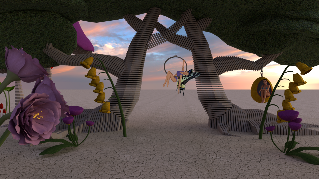 We can’t wait to bring you our botanical playground; a magical space for community gatherings and performance. Find us on the open playa, where you can climb on top cottages, across giant mushrooms, and into the trees to enjoy 360 degree panoramic views of the glittering playa-scape below. Find secret spots to swing, nap, slide and take refugee from the sun or harsh desert dust storms. Explore immersive environments, where resident magicians serve up healing elixirs in projection mapped environments. If you stay awhile, our collective of aerialists butterflies and forest creatures might descend from the canopy to mesmerize you with the grace and courage that only creatures of this unique grove can display.