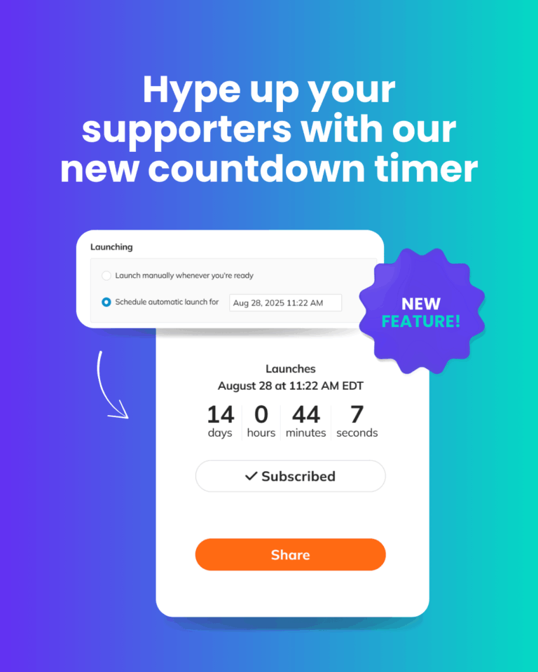 Schedule a specific date and time for your campaign to go live, and it will display a prominent countdown timer. Supporters can subscribe to receive a notification the moment it launches.