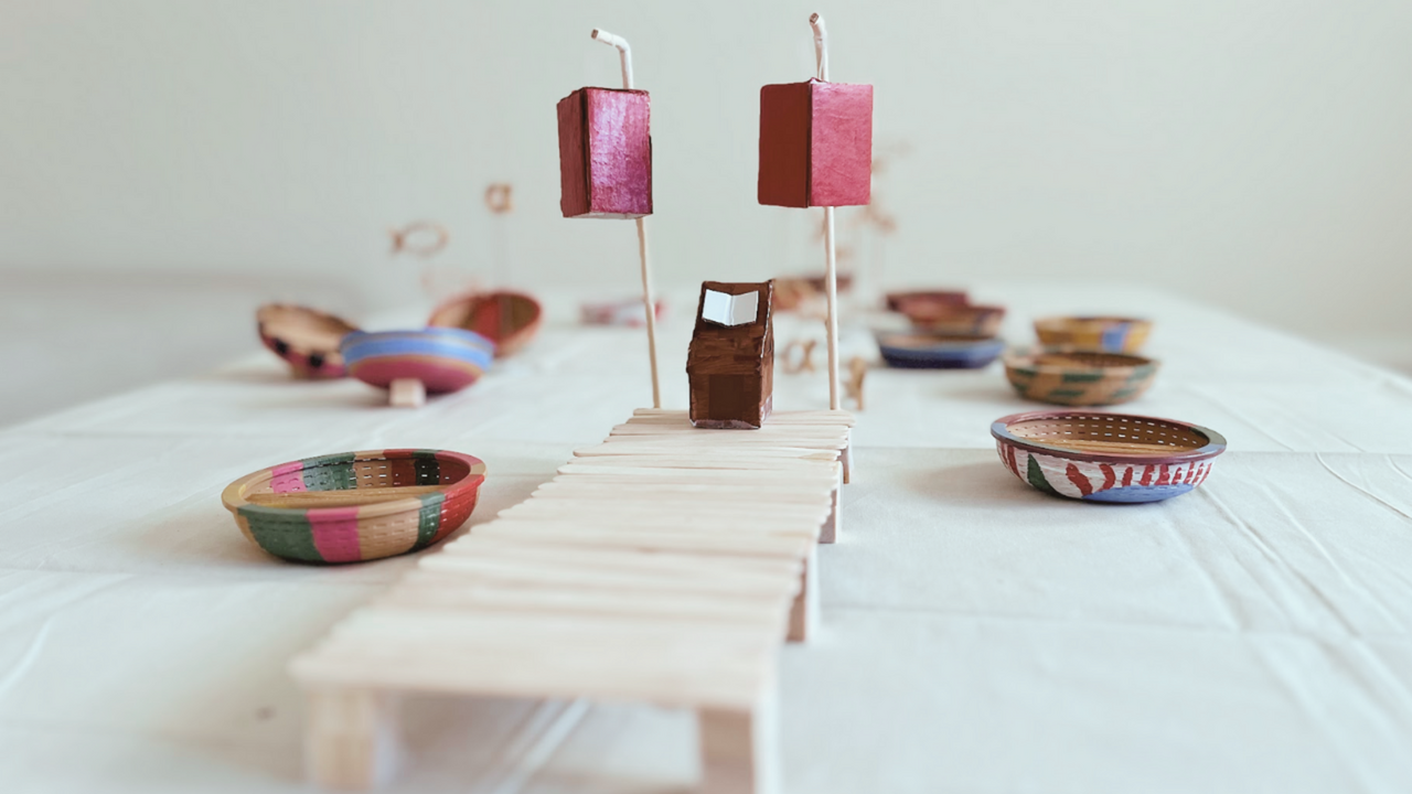 At the heart of it stands the Codex on the dock, a book inscribing both tale and puzzle. Each boat holds a memory fragment and the story deepens as tactile artefacts are discovered: a child's doll, a rice drum, a lost medallion, a basket of shifting sandworms, a whale bone, a water deity altar...