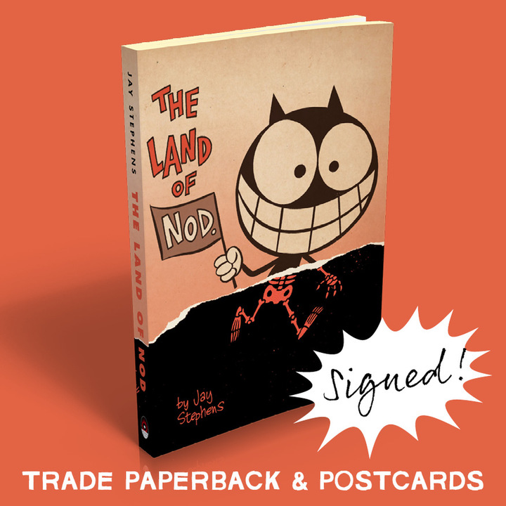 The Black Eye Books edition is printed in the compact 5.75 x 8.25 trim size to match previous Jay Stephens collections Dejects and Jetcat & Friends. It includes all Black Eye Books issues cover to cover, the Bonus National Magazine Award-winning story "Journey Into Fear", the risograph and mini poster artwork from the crowdfunding campaign extras, and an introduction by Stephen Bissette. It's also available in both limited edition hardcover, as well as trade paperback.