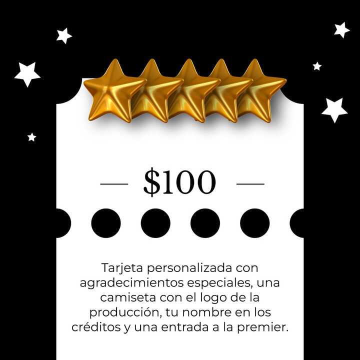 - $100 – Tarjeta personalizada + camiseta + tu nombre en los créditos finales + entrada a la premier.