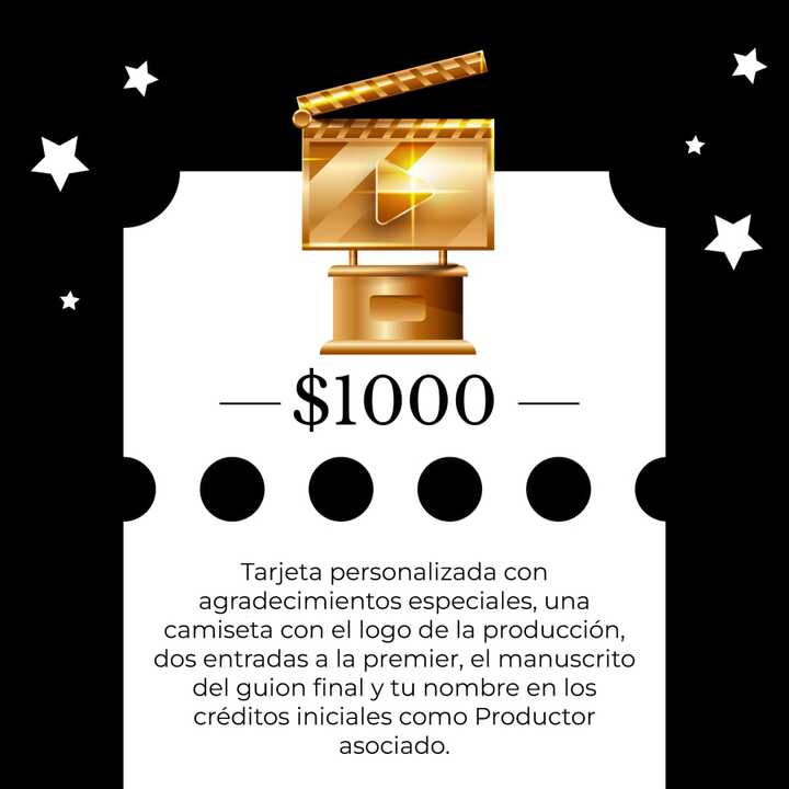 - $1,000 – Tarjeta personalizada + camiseta + dos entradas a la premier + manuscrito del guion final + tu nombre en los créditos iniciales como Productor asociado.