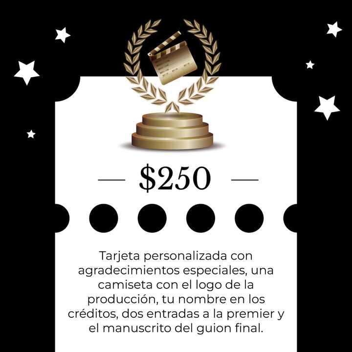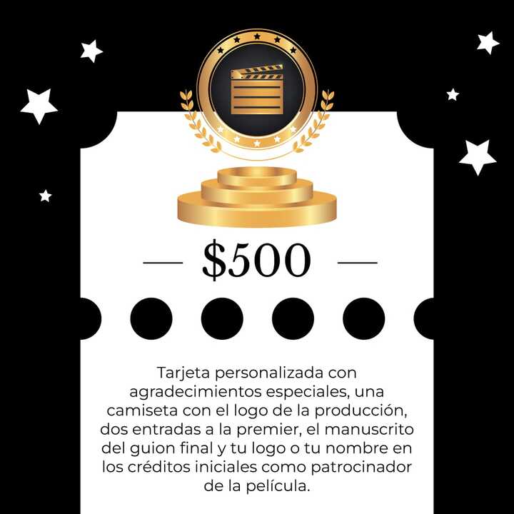 - $500 – Tarjeta personalizada + camiseta + dos entradas a la premier + manuscrito del guion final + tu logo o nombre en los créditos iniciales como patrocinador de la película.