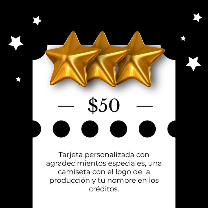 - $50 – Tarjeta personalizada + camiseta + tu nombre en los créditos finales.