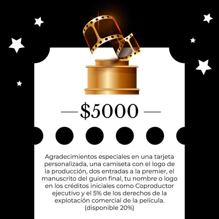 - $5,000 – Agradecimientos especiales en tarjeta personalizada + camiseta + dos entradas a la premier + manuscrito del guion final + tu nombre o logo en los créditos iniciales como Coproductor ejecutivo + 5% de los derechos de explotación comercial de la película.