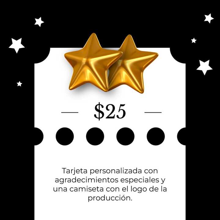 - $25 – Tarjeta personalizada + camiseta con el logo de la producción.