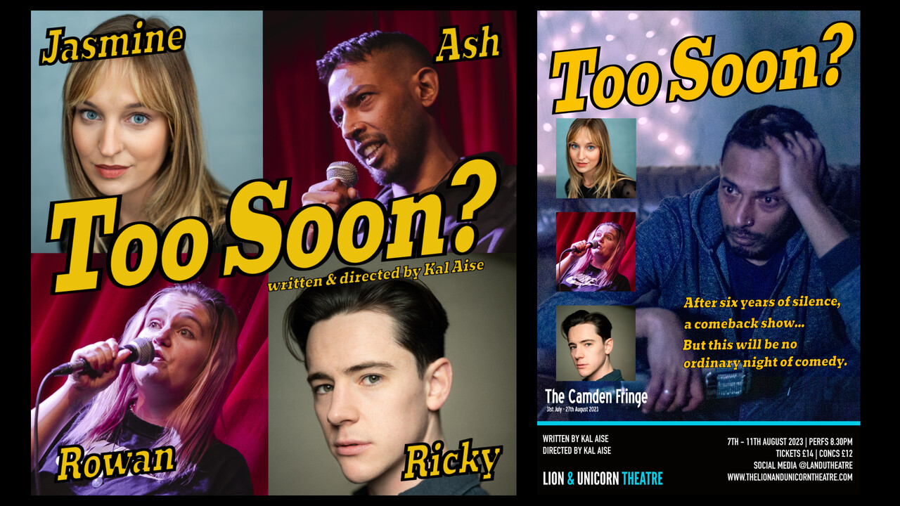 - Your name and credit as "Associate Producer" added to all future programmes, printed and digital marketing collateral for "Too Soon?", and any other productions by Kal Aise Productions, and to the Kal Aise Productions website (as soon as I have time to put it together and launch it!).