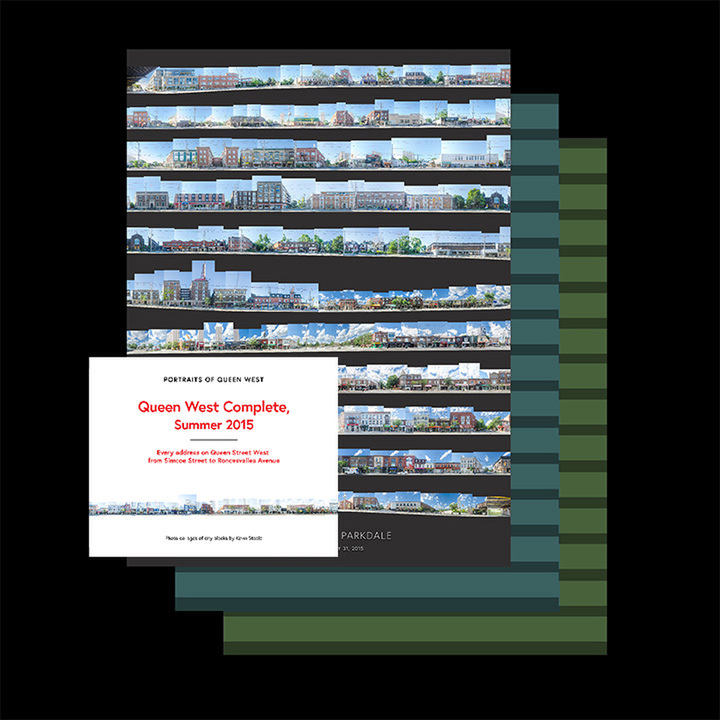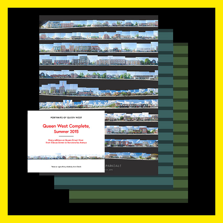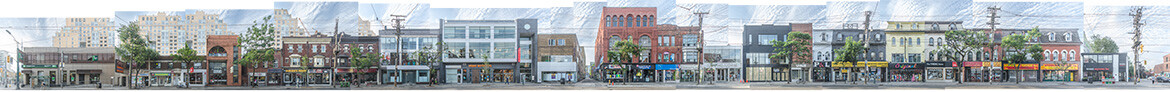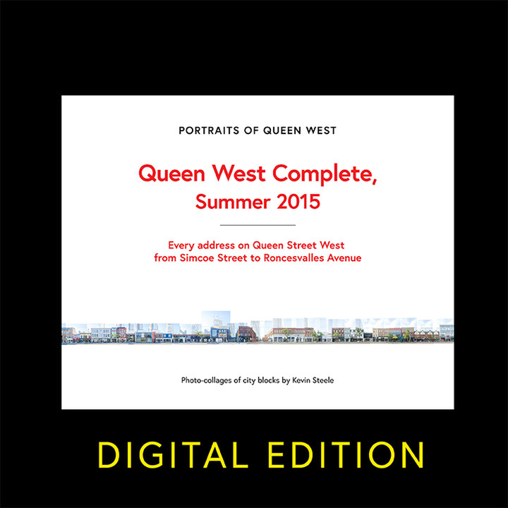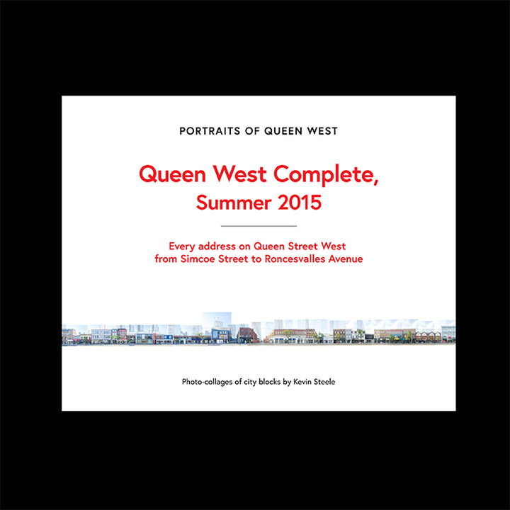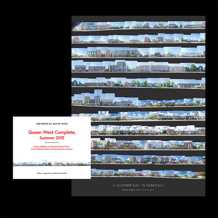 Queen West Complete, Summer 2015 captures every address from Simcoe Street to Roncesvalles Avenue in panoramic photocollages. This campaign produces three posters and a book and supports Portraits of Queen West, an ongoing photo and book project by Kevin Steele, documenting changes on one street spanning over 20 years.