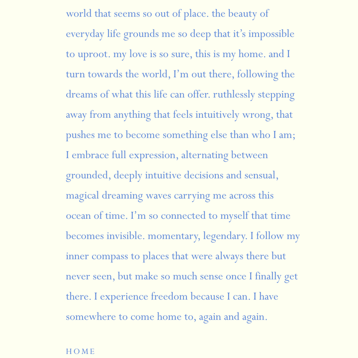 My work explores the human experience with depth and clarity (I’m a huge nerd about anything human). I could talk and explore about the dynamics and intricacies of human behaviour and expression for hours, and I love connecting these experiences to the world around us. I find a lot of peace in nature, by communing with trees and rocks, and watching the clouds pass by.