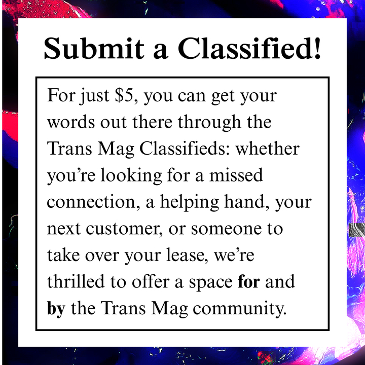 Whether it’s a missed connection or a mutual aid request, submit a Classified to get your words out there – as long as there are 150 characters or less of them. No Queer Magazine would be complete without a place to anonymously bare your soul.